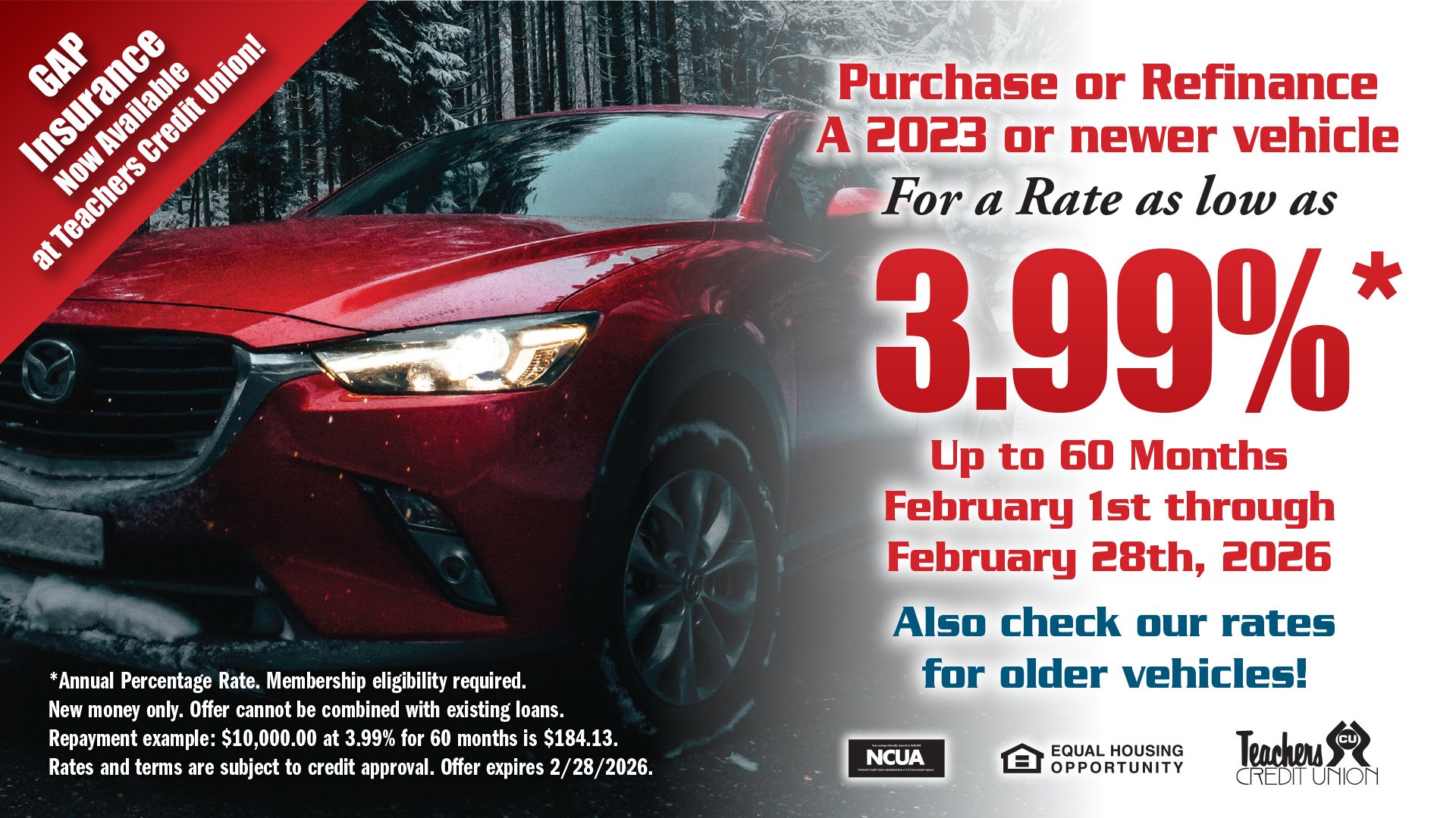 A 2023 or newer vehicle for a Rate as low as 3.99%* up to 60 Months. Also, check our rates for older vehicles! Loan special runs from February 1st to February 28th, 2026.
